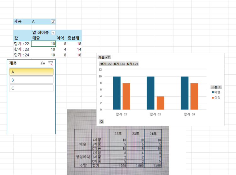 첨부 사진의 그래프를첨부 사진의 표로 막대그래프부분을 제품별로 잘라서 나타낼 수 있는지요?누적막대그래프 형태로...지금 그래프처럼 연도별 매출과 영업이익이 서로 붙어있었으면 합니다.도와주세요